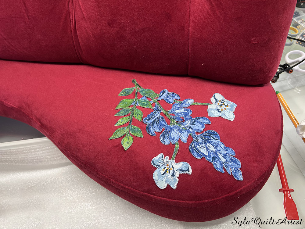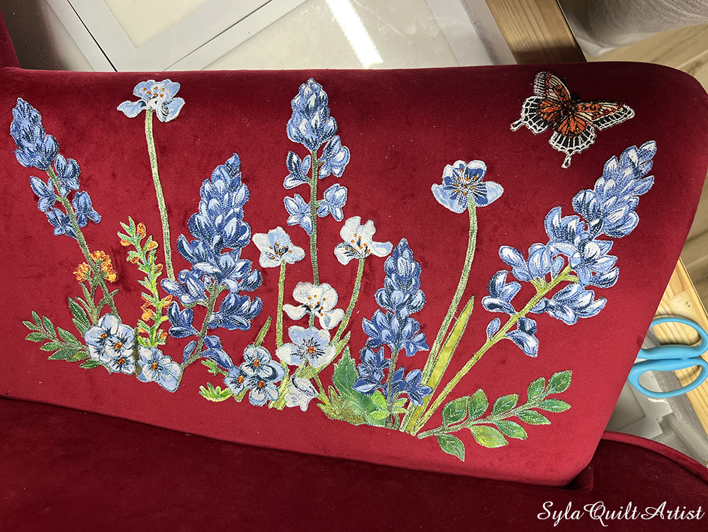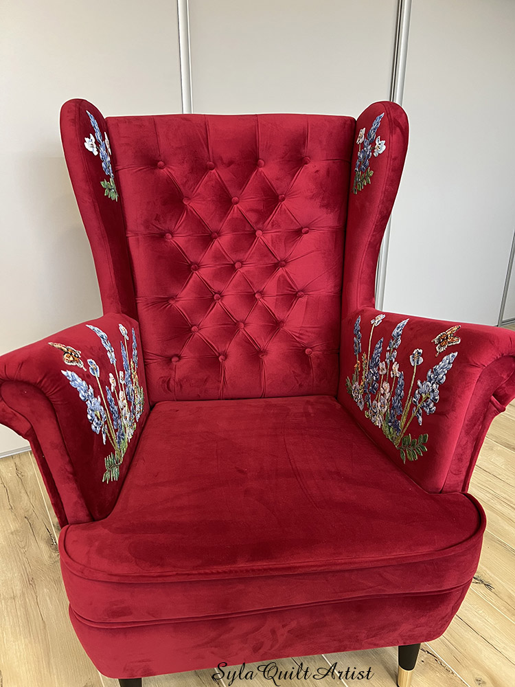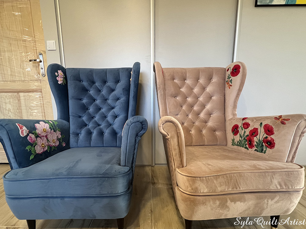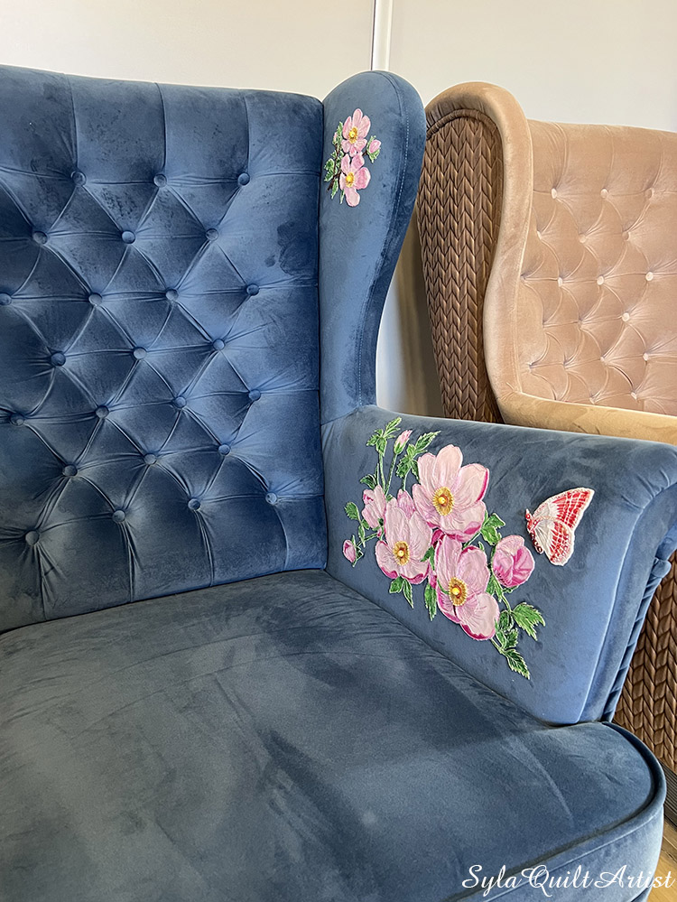 🌸 The first armchair — expressive, full of energy. The appliqué depicts blue and white flowers with green leaves, and on the right by the seat rests an butterfly. A composition that catches the eye and evokes the feeling of a summer garden.
