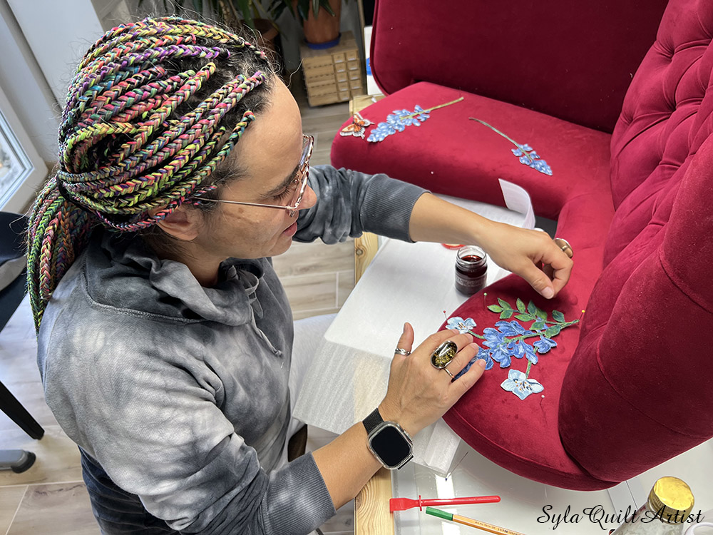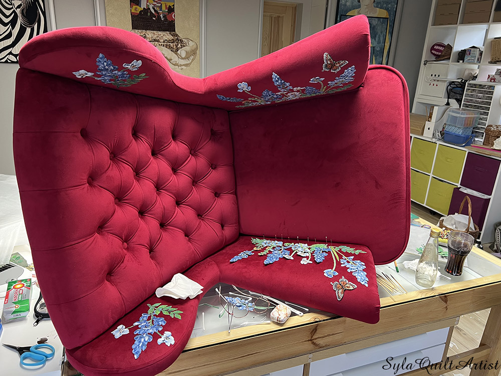 This project was a tremendous challenge for me. Time was short, and each armchair required many hours of work — sitting, focusing, and precision. After removing my orthopedic brace, I couldn’t keep my leg down because it swelled badly. When I raised it, my spine ached from long hours of sitting. It was a difficult and exhausting time — physically and emotionally. Yet every stitch, every beaded appliqué was a step toward something greater: toward art that truly matters
