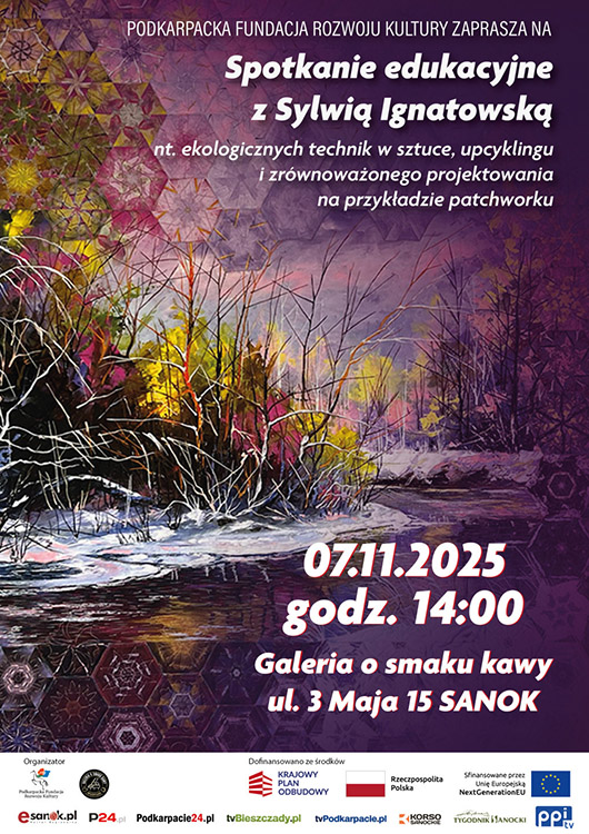 Po zakończeniu pracy nad fotelami, Podkarpacka Fundacja Rozwoju Kultury zorganizowała 7 listopada 2025 r. o godz. 14:00 spotkanie edukacyjne w Galerii o Smaku Kawy INTERPIANO przy ul. 3 Maja 15 w Sanoku. Miałam zaszczyt opowiedzieć o ekologicznych technikach w sztuce, idei upcyklingu i zrównoważonego projektowania.