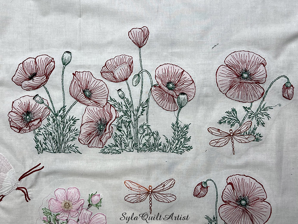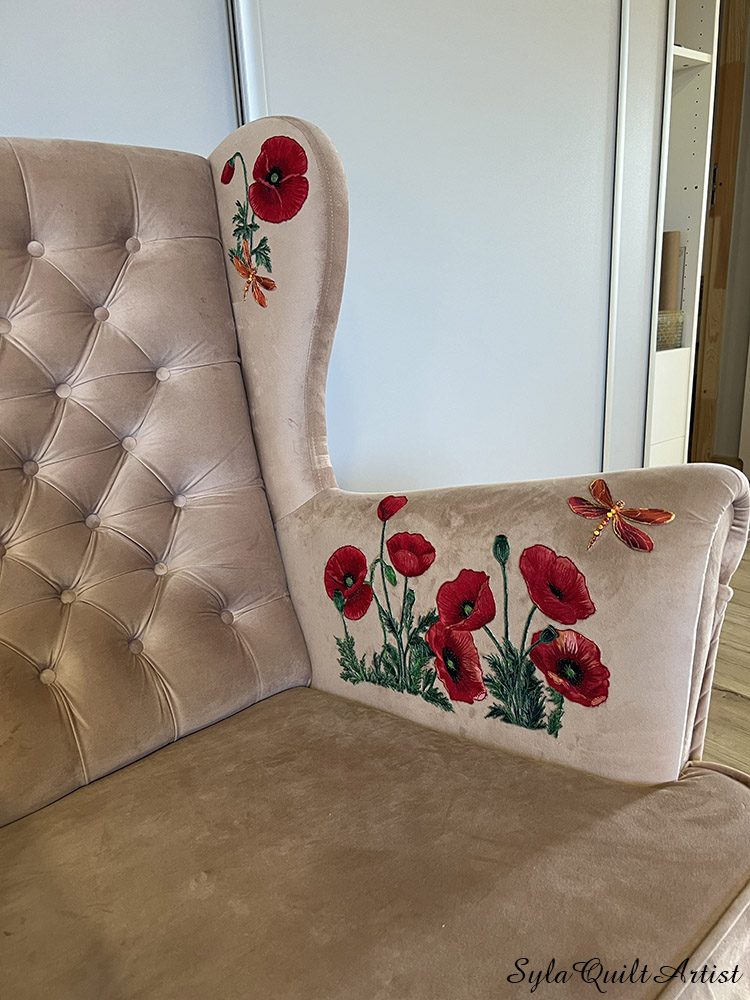 🌿 The second armchair — delicate, yet full of character. Red poppies bloom on the side panel and armrest, while two dragonflies hover above — one on the arm, the other near the flowers. A natural palette and subtle appliqué create a harmonious whole.