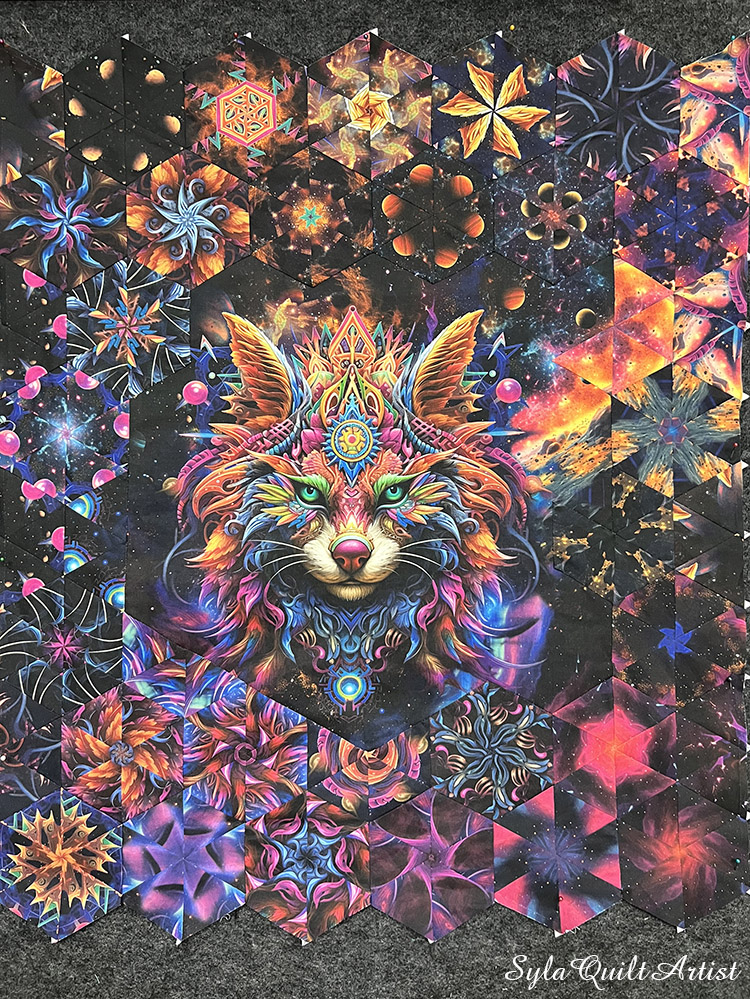 Für die endgültige Form verwendete ich die OBW-Technik. Ich schnitt es in kleine Dreiecke, die ich zu Halb-Hexagonen zusammennähte. Und so – in dieser Form – lag es ruhig in einer Schachtel bis September 2025. Warum so lange? Die Renovierung meines Ateliers und ein gebrochenes Bein hielten mich wirksam zurück. Aber schließlich kam der Moment: es musste fertiggestellt werden.