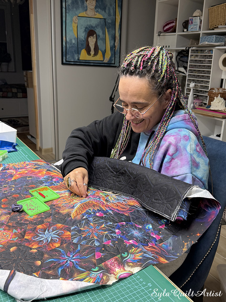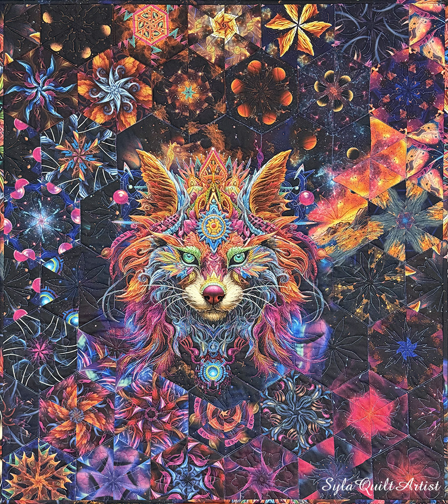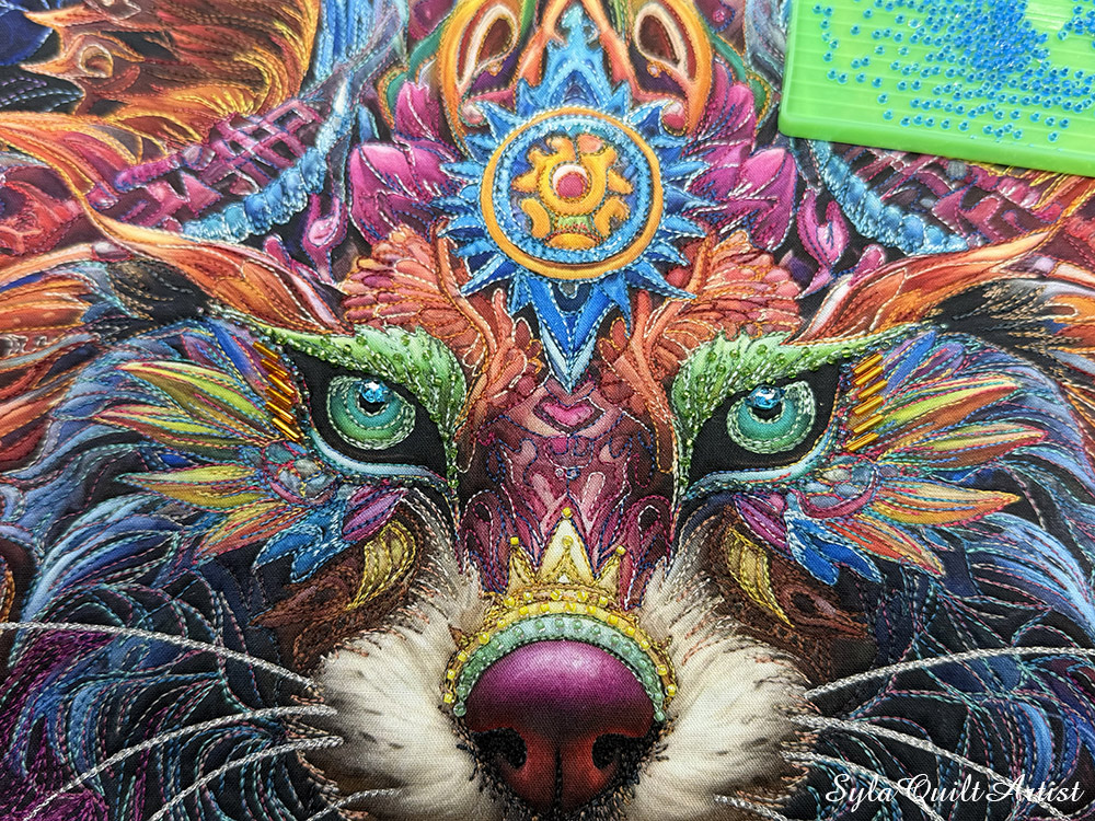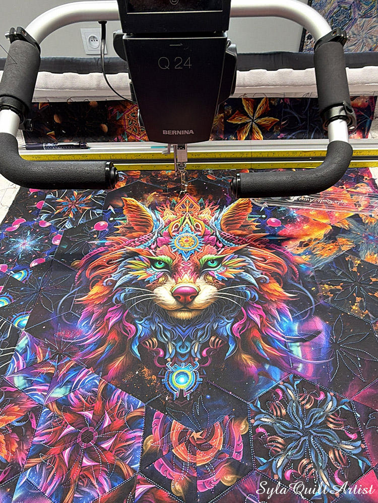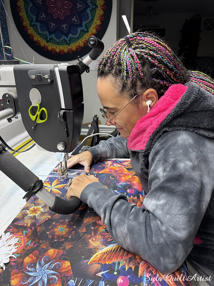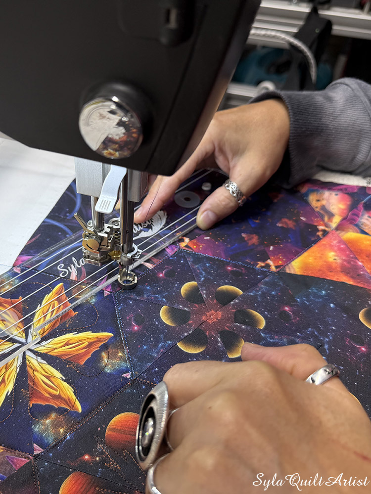 Genäht habe ich es auf meiner geliebten Bernina B325 – einer kleinen, aber tapferen Maschine, die mich bei vielen Projekten begleitet. Das Quilten führte ich auf der Bernina Q24 Longarm aus, was mir Raum gab, mit Details zu spielen. Ich fügte Perlen sowie goldene und silberne Fäden hinzu – subtile Glanzlichter, die den kosmischen Charakter der Arbeit wunderschön betonen.